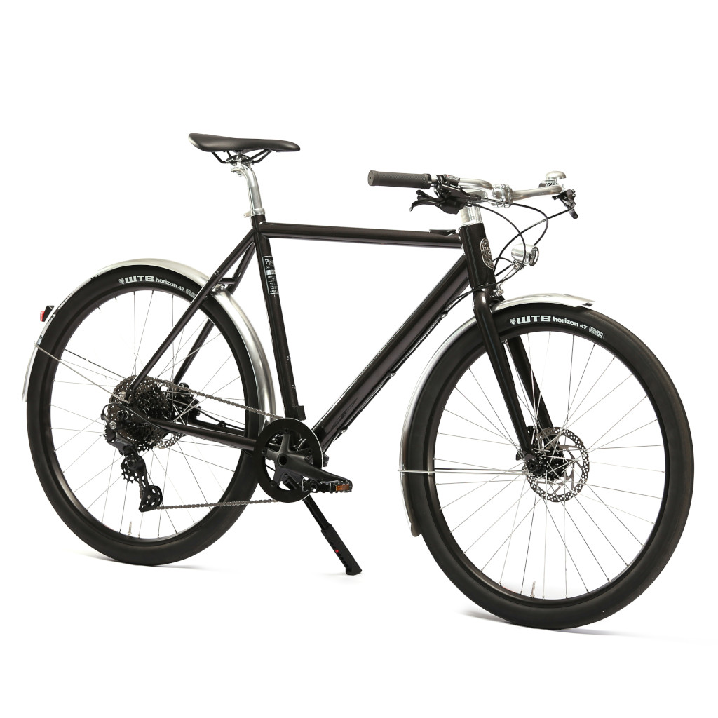 We took Pelago’s Hanko Street and added 55mm Pelago fenders with Panaracer Gravelking tires, Busch und Müller dynamo lights with a little custom clamp for the rear and a front rack to build a perfect singlespeed commuter bike.